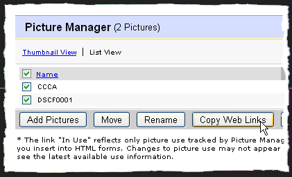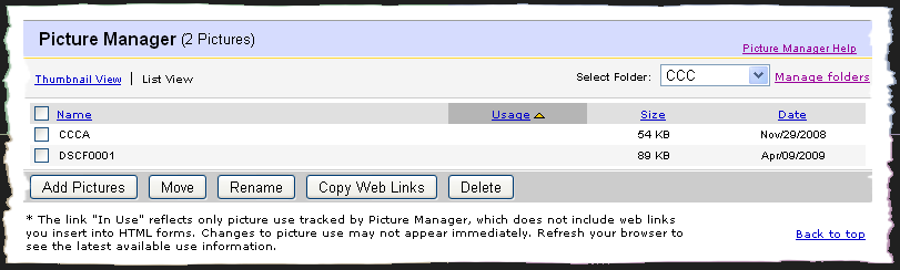 * The link "In Use" reflects only picture use tracked by Picture Manager, which does not include web links you insert into HTML forms. Changes to picture use may not appear immediately. Refresh your browser to see the latest available use information.Understand you can not entirly depend on the "Usage" column being filled in for pictures you may have used in other than eBay standard places on the selling (View Item) pages. For example, if you have used Picture Manager to obtain URLs for display of pictures in the body of your item descriptions then those will not show a usage. |