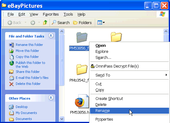After all the saving is done DO NOT DELETE ANY FILES UNTIL YOU FOLLOW THE PROCEDURE BELOW !!! Go to the desktop of your computer and double click on the eBayPictures folder to open it. It will look something like the following screen shot but probably with more files and folders in it. Rename each of the folders, removing the "_files" from its name. Right click once on the folder and choose "Rename" then delete off the _files from the end of its name: