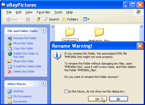 As you rename you will be prompted with a warning message. Go ahead by clicking "Yes". We want to get rid of the non-picture files and disassociating them from the folders is the first step necessary to accomplish that: