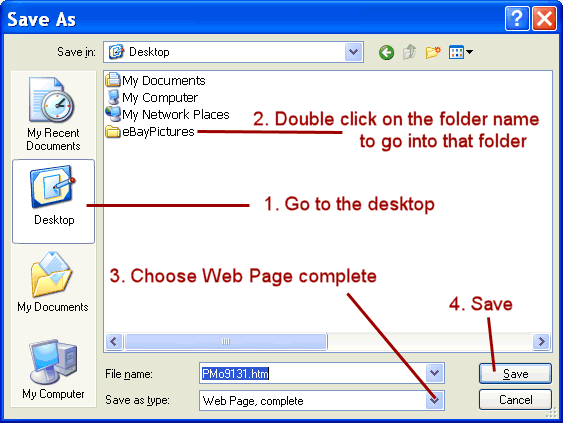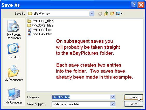 Performing the Downloads If you will be downloading, I suggested above creating a folder on your computers desktop so will be easy to find and name it "eBayPictures". Based on that being the folder, following is the procedure to follow for the actual downloading. When the new window opens after having clicked the Download button, wait for that page to complete loading. That may take quite a while depending on the number and size of the pictures being displayed within it. Then, in your web browser's tool bar click File, then Save As. That will produce a window like this: